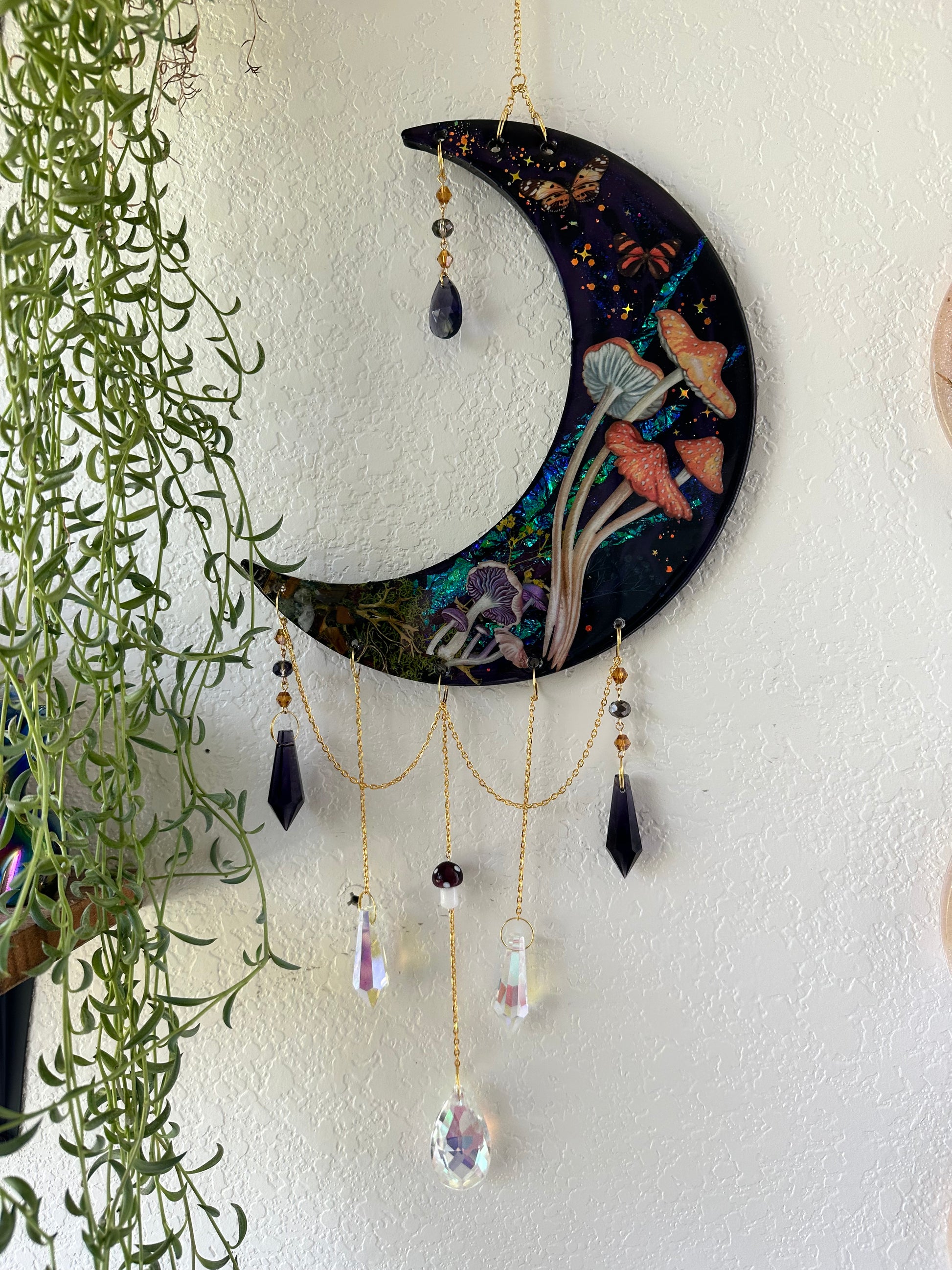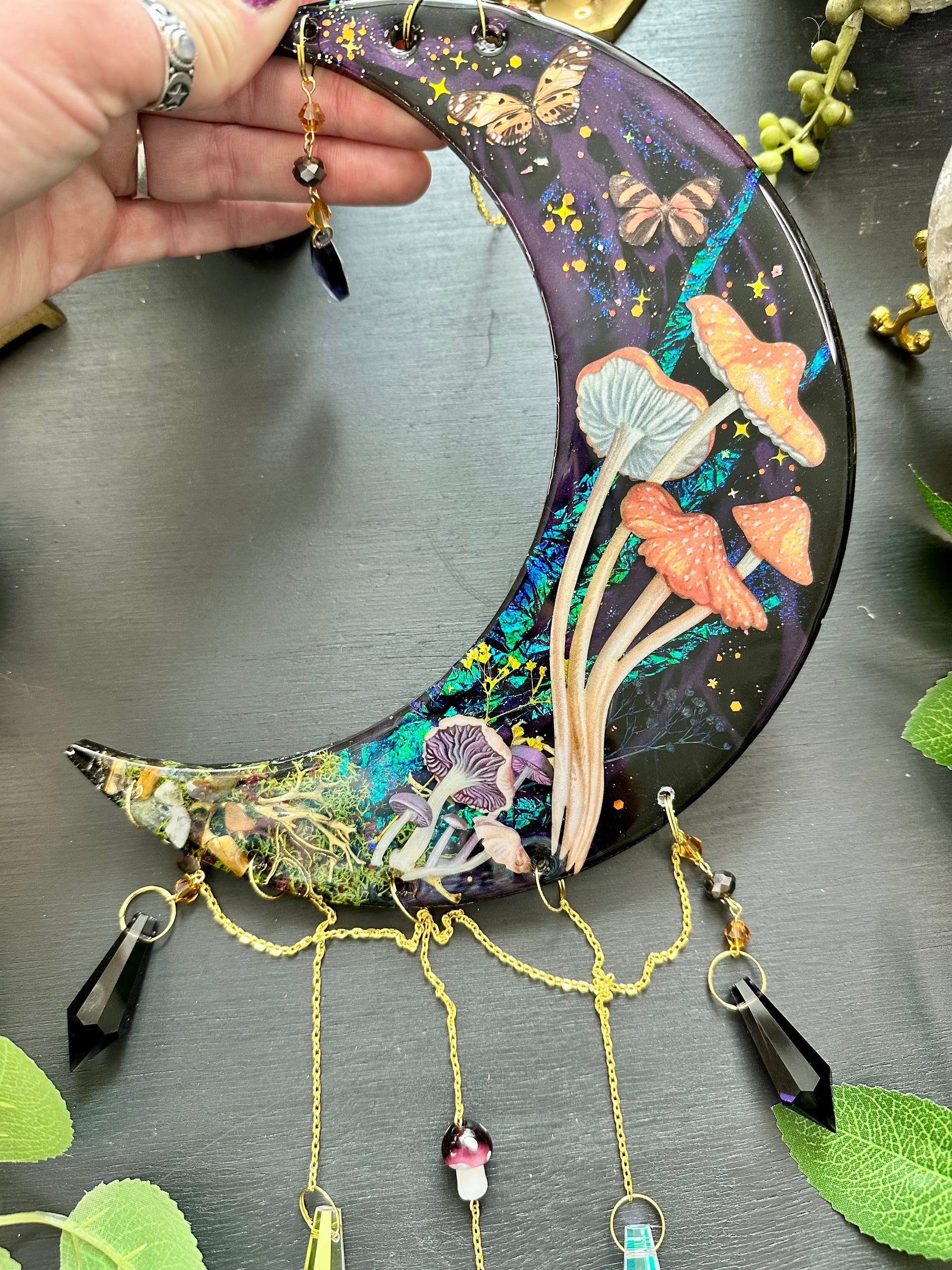 Made with resin, dried botanicals, paper specimens, gold hardware, glass beads