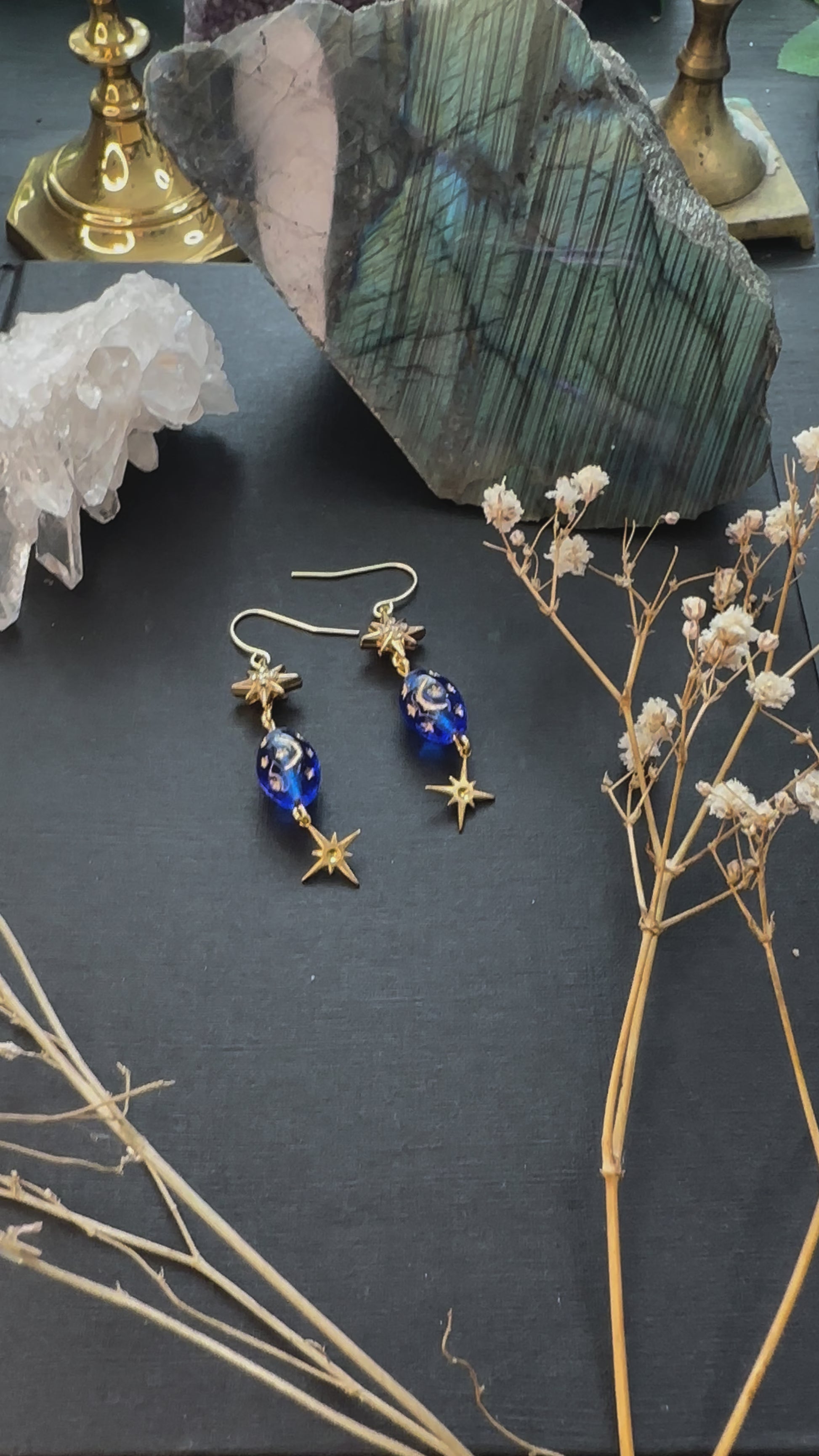 Made with 18k gold plated ear hooks, glass beads, brass charms